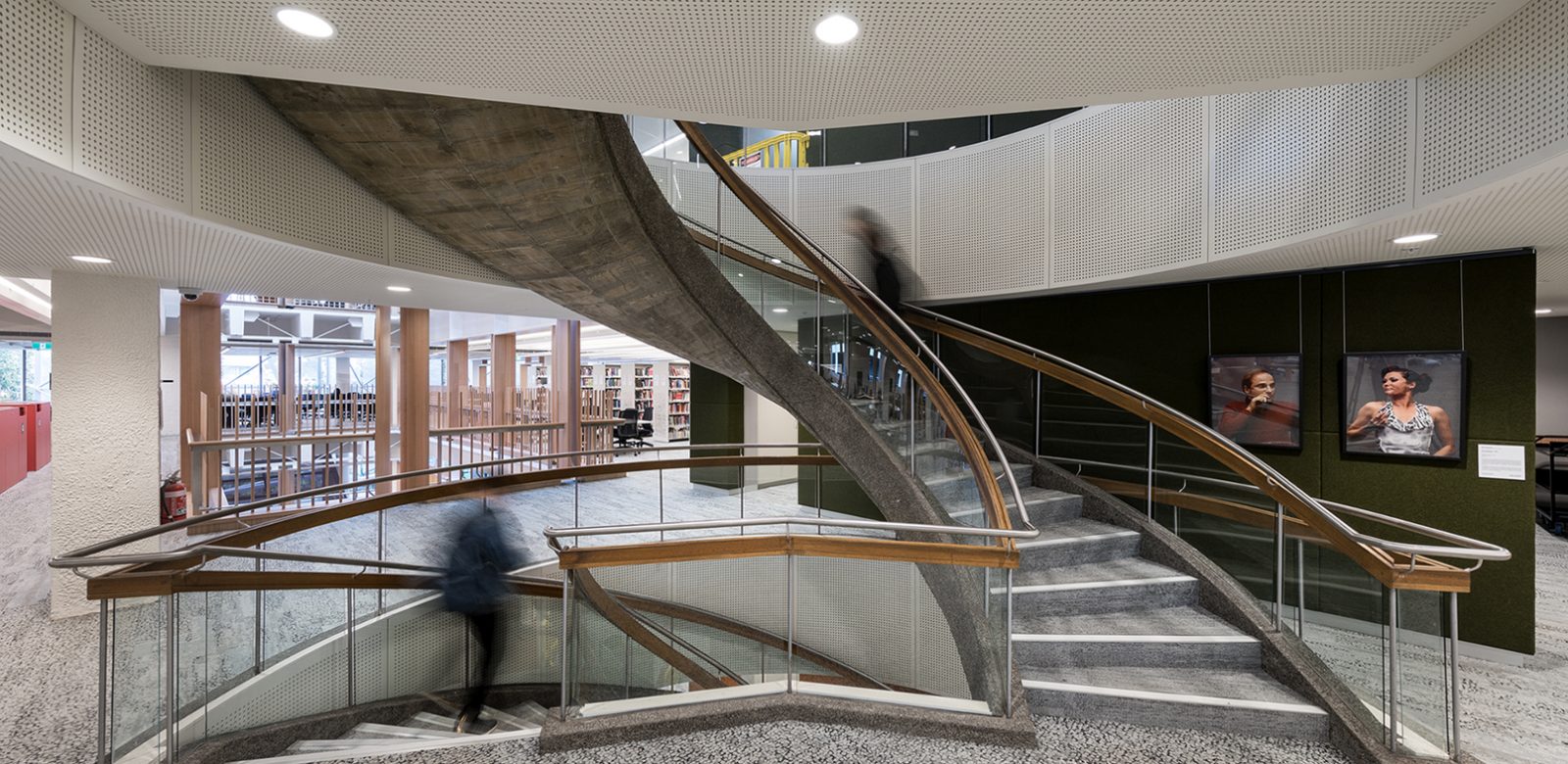 A responsive refurbishment of the Caulfield Library doubling the number of study seats, and segregating the four levels into different activity zones creating more efficient and functional spaces.